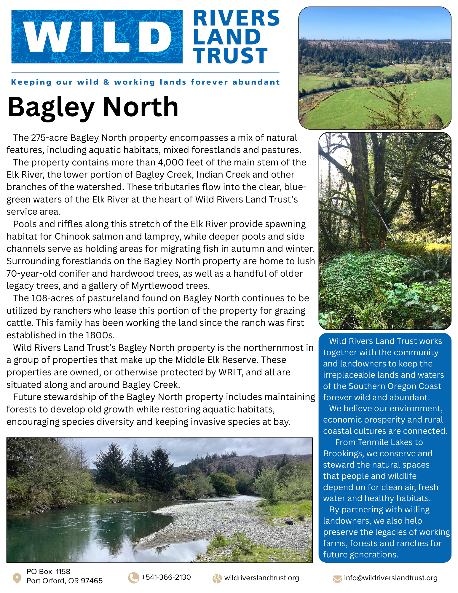 Wild Rivers Land Trust purchased the 217-acre property to protect it from logging and the resulting fragmentation of wildlife habitat on the Elk River. The goal was to manage the land in a way similar to the adjacent National Forest, helping to promote old-growth forests and protecting fish and wildlife in a wild and untouched area.